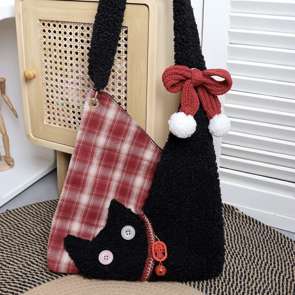 ✨🐱【in cream mall】Black Cat Contrast Crossbody Bag - Your New Fashion Favorite! 👜🖤 【in cream mall】presents the Black Cat Contrast Crossbody Bag, inspired by playful hide-and-seek loving black cats, blending style with functionality. Available in two materials: the red version is made of soft teddy fabric and plaid cloth, while the red PU version features water ripple PU fabric paired with plaid cloth, each style exuding unique character. 🌟 Product Features: - Material Choices: The red version is made from teddy fabric and plaid cloth; the red PU version is crafted from water ripple PU fabric and plaid cloth. - Bag Dimensions: Overall dimensions are 32cm wide x 36cm high, with an effective capacity of 32cm wide x 25cm high. - Functional Design: Includes an extendable chain strap for crossbody wear, offering versatile carrying options. - Practical Space: The interior fits a tablet but not a laptop, ideal for daily use.