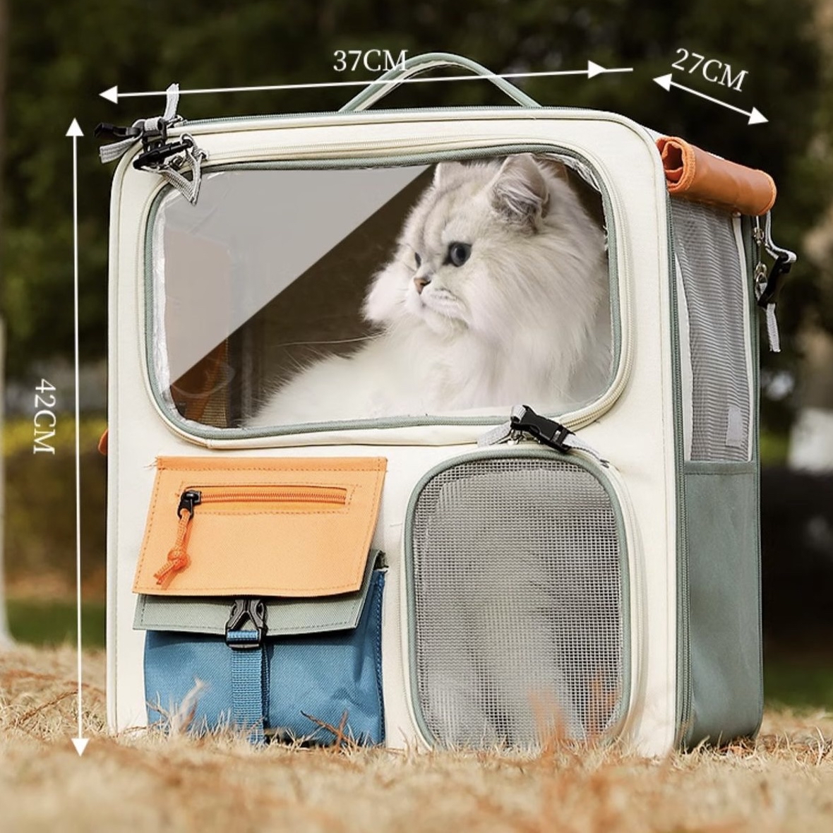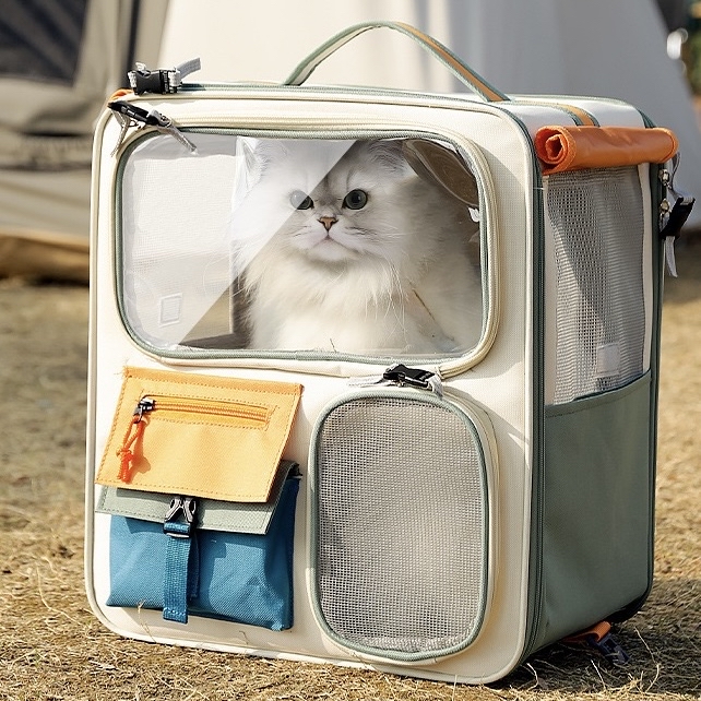 拉桿/雙肩帆布寵物包 超大容量,依舊採用定型鋼絲設計,在保證毛孩子充分活動空間的基礎上堅固形態穩定,出行不變形。在材質上選用高度耐磨的加密牛津布,多口袋設計,便於收納。同時,包包左右和正面都有捲簾網紗窗口,在保證通風透氣的同時有效遮光防止應激。